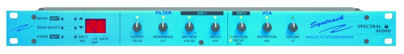 The Syntrack combines a Digital Wavetable Oscillator with an Analogue Filter (Cascade Filter). The Filter Output passes through the Analogue Distorter which shapes your Sound to be powerful and rough. The Syntrack offers 99 Programs and easy programming because each Parameter has a Pot. Every Operation on the Knobs will cause a Controller to be send to MIDI Out. And each Parameter listens to its Controller on MIDI In. The Lamps above the Knobs displays a MIDI controller remote of the pots or a setting of this parameter by the program. The Wavetable can be expanded by a second chip. The Syntrack also offers an external audio input.
